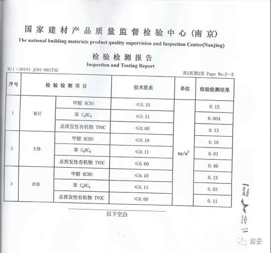為了弄清真相,在上海陪伴孩子治療期間, 陳女士撥打南京的12315熱線,請求幫助。當時,鼓樓區消費者權益委員會找來了國家建材產品質量監督檢驗中心(南京)對租住的房子進行檢測。2019年3月1日,檢測報告交到消保委,報告上顯示,房子客廳、主卧、次卧的甲醛含量均有超標。