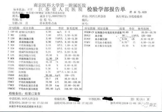 2018年11月4日,孩子在江蘇省婦幼保健院檢查,血小板指數低至38,脾腫大。