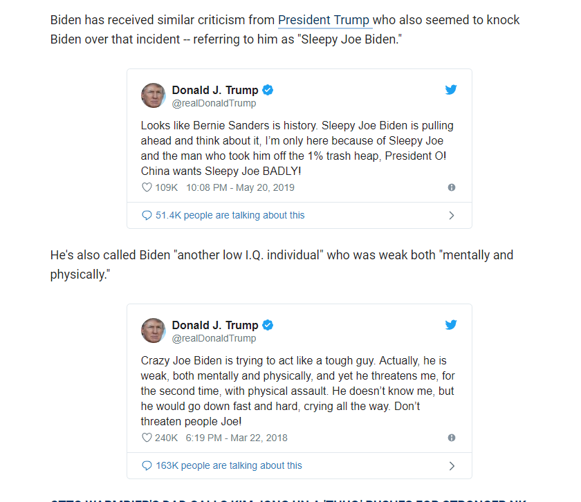 ——值得一提的是,在批評拜登這件事上,朝中社和特朗普大爺出奇的一致,特朗普稱拜登為“昏昏欲睡的喬·拜登”。