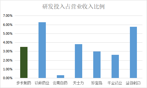 在步長製藥2018年年度報告中露臉的其他醫藥企業研發投入情況也好不到哪裏去。其中以嶺藥業研發投入佔營業收入比例為6.29%,雲南白藥研發投入佔營業收入比例為0.35%(人家畢竟有“老配方”),天士力研發投入佔營業收入比例只有3.83%,珍寶島研發投入佔營業收入比例只有2.99%,千金藥業研發投入佔營業收入比例只有2.64%,益佰製藥研發投入佔營業收入比例只有5.76%。