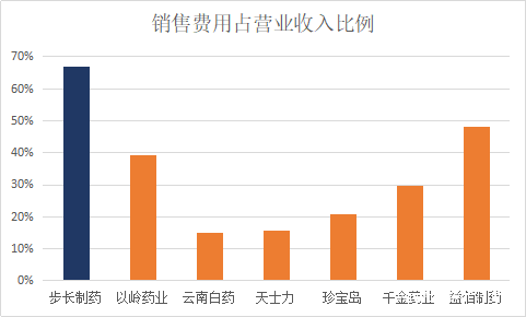 還是步長製藥2018年年度報告中露臉的其他醫藥企業,像以嶺藥業銷售費用佔營業收入比例為39.23%,雲南白藥銷售費用佔營業收入比例為15.15%,天士力銷售費用佔營業收入比例為15.75%,珍寶島銷售費用佔營業收入比例為20.82%,千金藥業銷售費用佔營業收入比例為29.61%,益佰製藥銷售費用佔營業收入比例為48.18%。這麼看來,這些藥企對營銷方面的依賴還真都不如步長製藥,還算良心了。