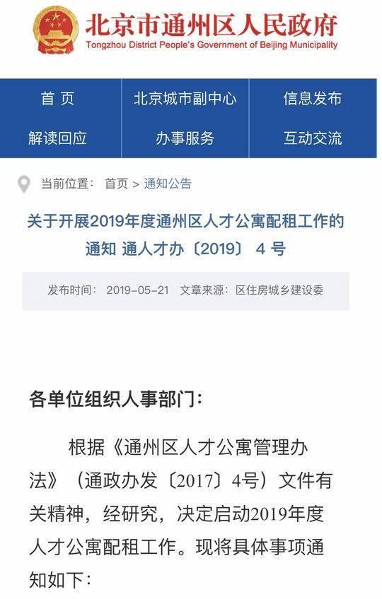 5月21日晚,封面新聞從北京市通州區住房城鄉建設委獲悉,《關於開展2019年度通州區人才公寓配租工作的通知》(下文簡稱《通知》)已公佈,這意味着被稱為北京城市副中心的通州已拉開人才公寓配租申請序幕。