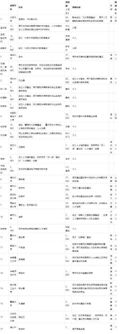 捐贈教育領域的企業家中,最多的是捐給母校。百度的李彥宏、馬東敏夫婦是單筆捐贈最多的,以集團名義向母校北京大學捐贈6億元。過去一年受捐最多的母校是北京大學和清華大學,分別受捐9.6億元和4.7億元,其他受捐過億的大學母校還有:深圳大學、中國科大、武漢大學、福州大學、南開大學、武科大和西安交大。