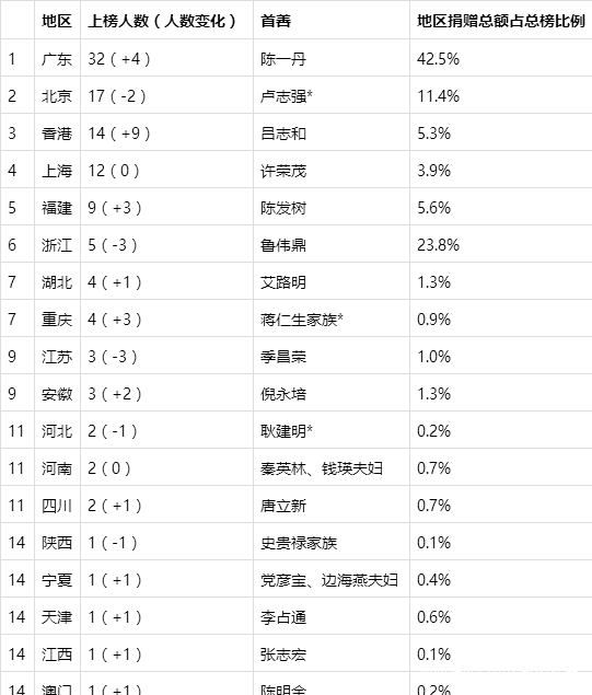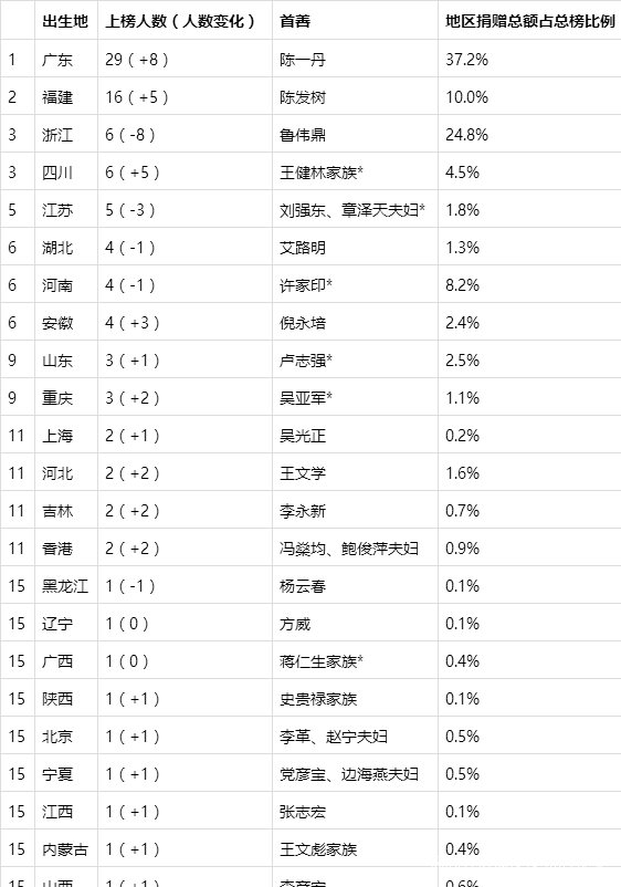 粵商比去年增加8人,以29人穩居第一;閩商比去年增加5人,以16人上升至第二;浙商比去年驟減8人,以6人退居第三,但浙商捐贈總額佔總榜比例最高;川商進步很大,比去年增加5人,以6人首次排進前三;蘇商比去年減少3人,以5人保持第四。從出生地來看,有17位新的地方首善。