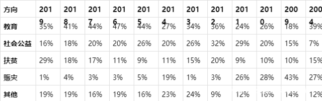 從歷年捐贈方向來看,今年教育領域的捐贈人數仍然最多,佔35%,但比去年減少6個百分點;扶貧方面這五年呈逐年上升態勢,今年比去年增加11個百分點,以29%排名第二;捐贈慈善基金會等社會公益方面的佔16%,比去年減少2個百分點,排名第三;醫療方面比去年減少7個百分點,以6%排名第四。