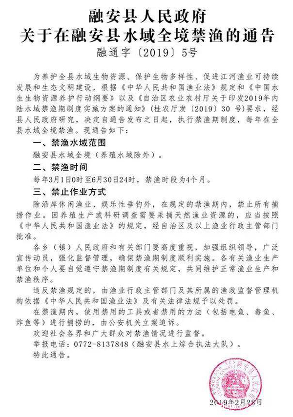 澎湃新聞注意到,今年2月28日,融安縣人民政府發佈《關於在融安縣水域全境禁漁的通告》。通告顯示,禁漁水域範圍為融安縣水域全境(養殖水域除外),禁漁時間為3月1日0時至6月30日24時,共6個月。除沿岸休閒漁業、娛樂性垂釣外,在規定的禁漁期內,禁止所有捕撈作業。違反禁漁規定的,由漁業行政主管部門及所屬的漁政監督管理機構依據《中華人民共和國漁業法》及有關法律法規予以處罰。