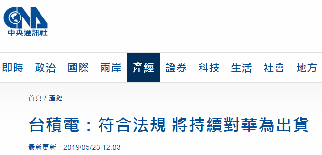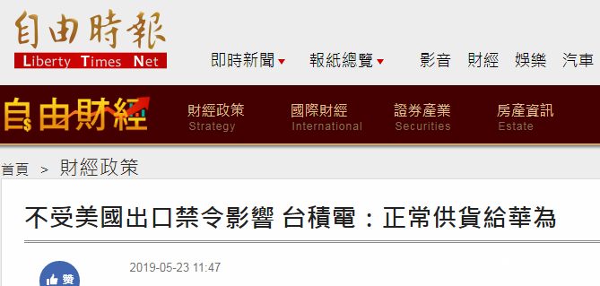 另外,台灣“中時電子報”5月23日報道台積電對華為持續出貨一事時,用了這樣的説法:無懼老美!台積電有種,力挺華為。