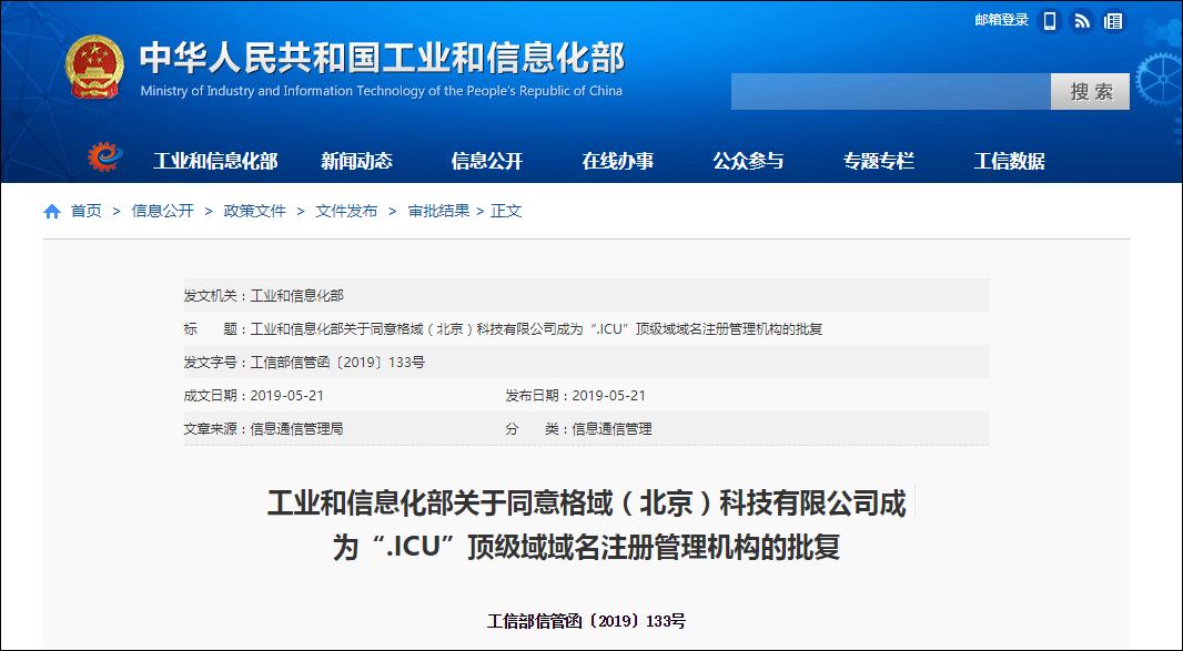 工信部同意格域(北京)科技有限公司成為“.ICU”頂級域域名註冊管理機構_風聞