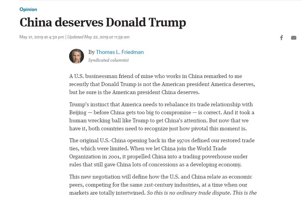 看了席胖早上起來分析的華盛頓郵報文章,心理有點感慨,這裏再分享一篇托馬斯·L·弗裏德曼的文章。名字叫“中國活該遇上特朗普”。