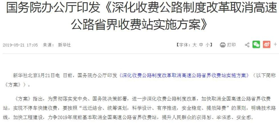 近日,國辦印發《深化收費公路制度改革取消高速公路省界收費站實施方案》,提出力爭2019年底前基本取消全國高速公路省界收費站,各省(區、市)高速公路入口車輛使用ETC比例達到90%以上,實現手機移動支付在人工收費車道全覆蓋。