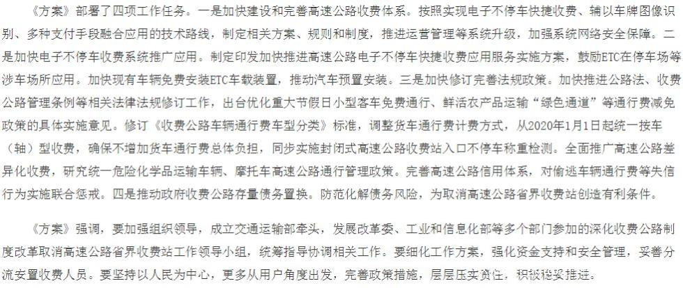 《方案》指出,為貫徹落實黨中央、國務院決策部署,進一步深化收費公路制度改革,加快取消全國高速公路省界收費站,實現不停車快捷收費,要按照“遠近結合、統籌謀劃,科學設計、有序推進,安全穩定、提效降費”的原則,明確技術路線,加快工程建設,力爭2019年底前基本取消全國高速公路省界收費站,提升人民羣眾的獲得感、幸福感、安全感。