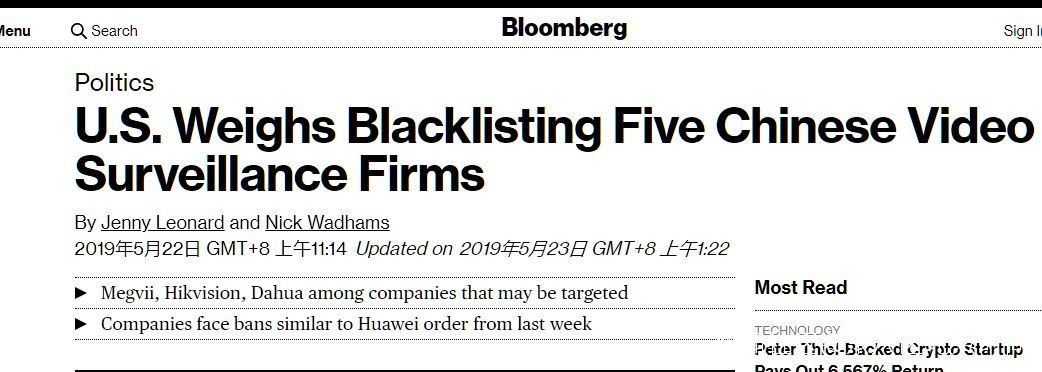 多家美媒22日曝出,美國政府考慮將5家中國企業列入與華為類似的“黑名單”,禁止他們獲得美國零件與軟件,其中包括海康威視與浙江大華。據彭博社23日最新消息,消息人士稱,另外3家公司是曠視科技、美亞柏科和科大訊飛。