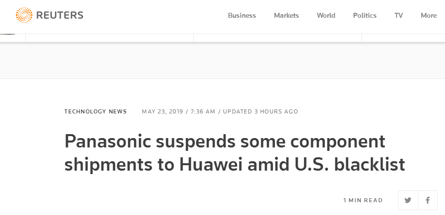 據路透社報道,當地時間23日,松下公司在一份聲明中表示,已指示僱員停止與華為及其68家關聯企業的交易,以回應美國政府對華為的禁令。