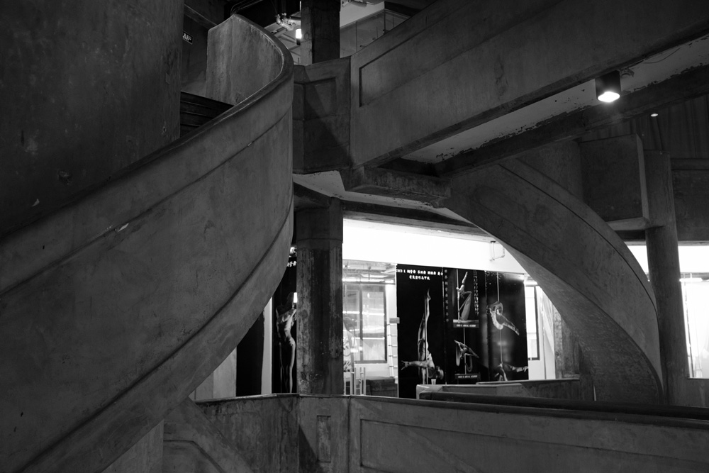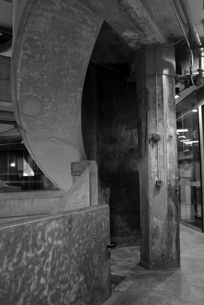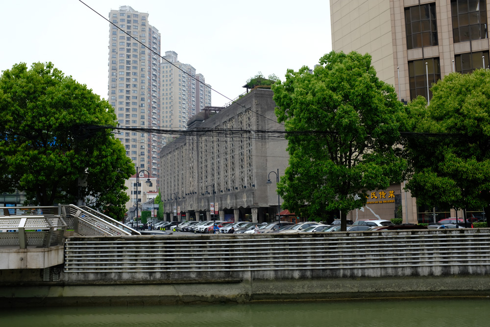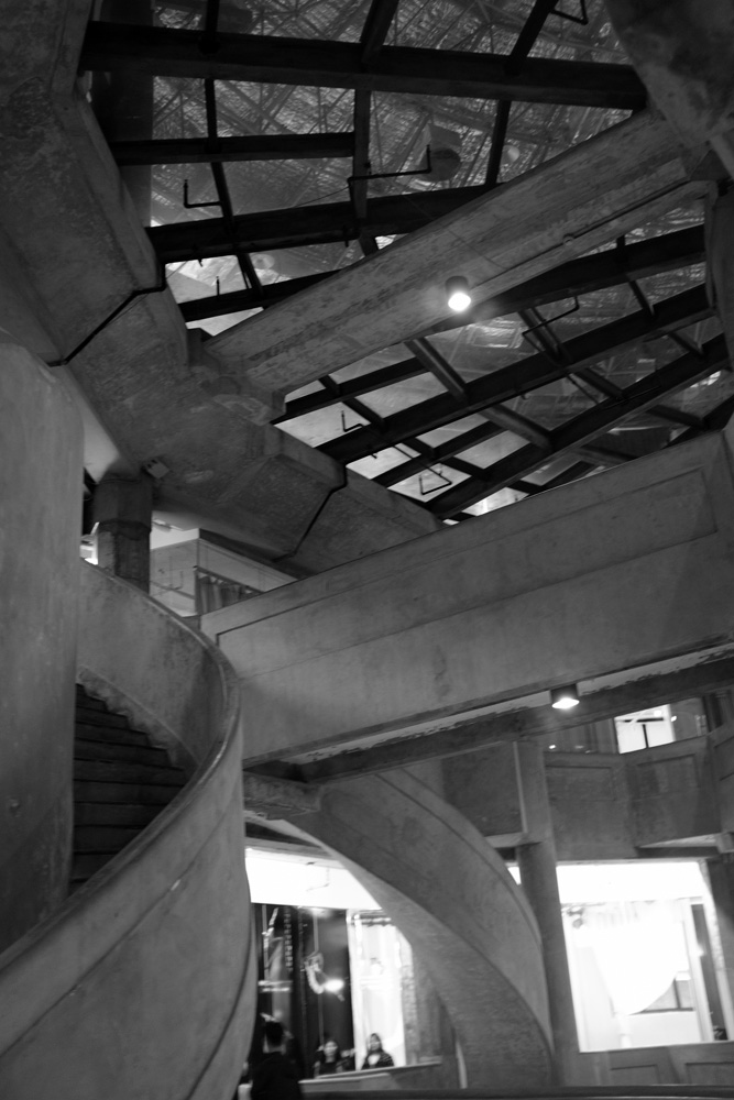 這是上海很少見的粗野主義建築,奇特、詭異,好像全上海找不出第二個相似的。外表不特別,但方形外樓套着圓形內樓,內外樓之間縱橫交錯着各種天橋和坡道,這是當年要屠宰的牛通過的通道。圓形內樓裏面是中空的,很多懸空的弧形樓梯和暗梯,估計是工作人員與牛道分行用的。