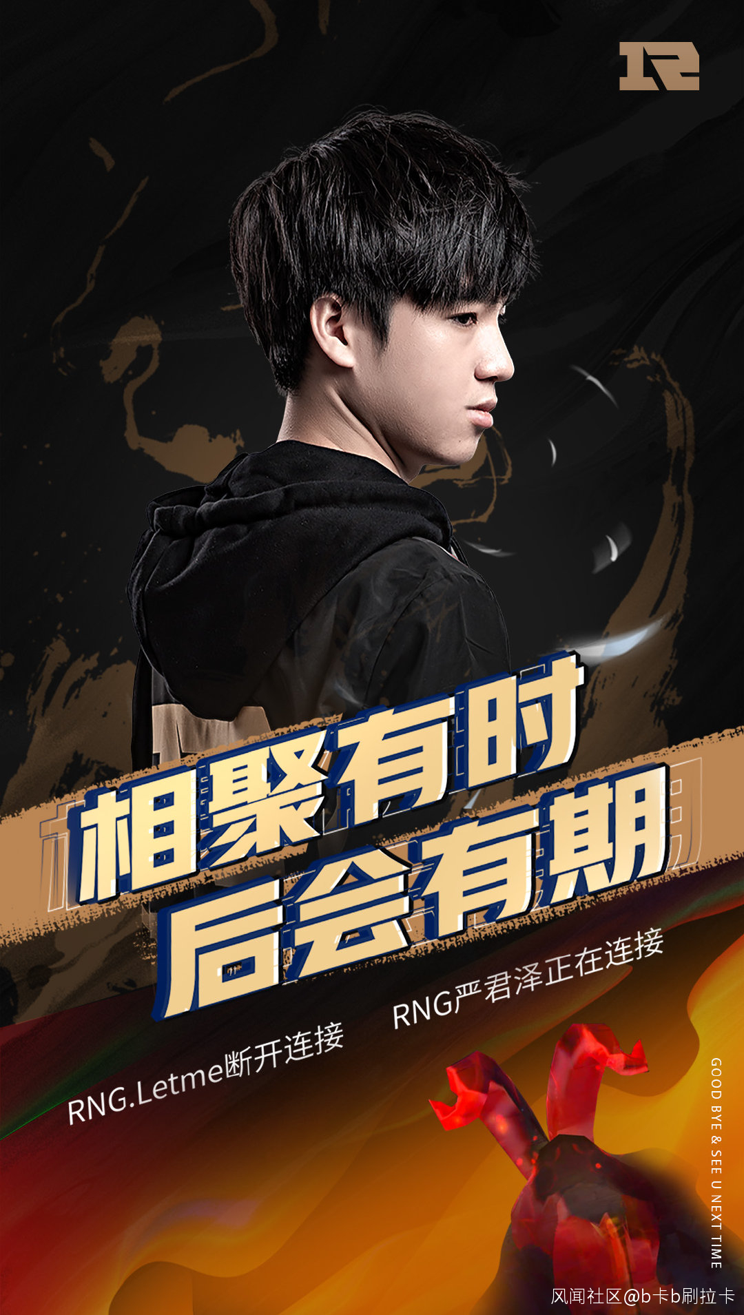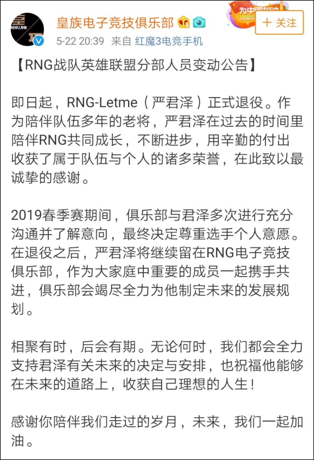 北京時間5月22日晚8時38分許,RNG上單選手嚴君澤(id:Letme)發表微博告別賽場,隨後RNG官宣Letme正式退役。這是RNG建隊以來第二個退役的職業選手,也是亞加達亞運會中國代表隊英雄聯盟項目第一個退役的選手。
