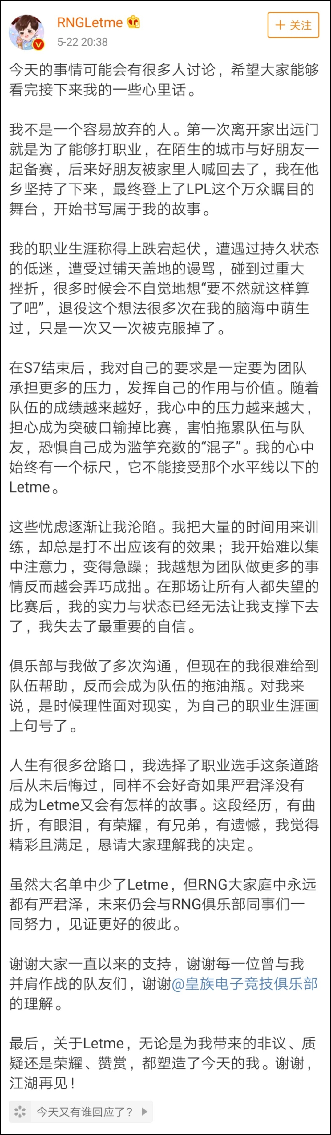 在Letme的退役微博中,他還是那個處處為隊伍着想的人。letme表示,自己並不是一個輕易放棄的人,但是在打完s8之後狀態太差了,也不想被大家説成是拖油瓶,可是在經過了一個春天的休息之後,他還是覺得自己的狀態不能發揮到最好。於是,他選擇不再繼續當隊伍的拖油瓶,毅然決然地選擇退役。