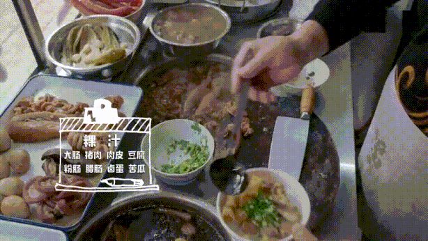 粿角入鍋燙過撈起,滷蛋切半,豬腸等各色滷味碼上,最後,伴隨着一勺香氣濃郁的滷湯澆上,粿汁上桌前最後的儀式感也隨之完成。