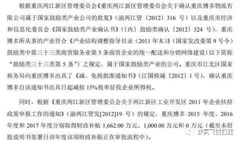 另外,重慶博多 2015 年度、2016年度和 2017 年度分別取得財政補貼1,662.00 萬元、1,000.00 萬元的補貼,2018年的補貼正在“審批流程”中。
