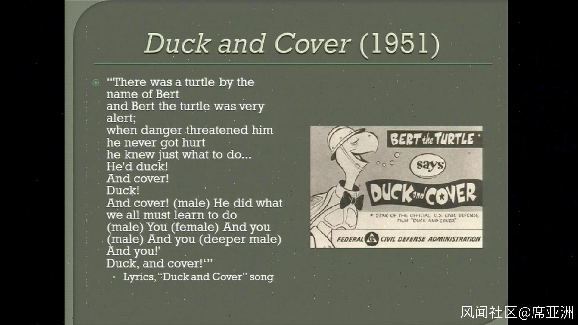 上世紀50-60年代,冷戰中的美國組織全民進行三防教育,直譯“卧倒和找掩護”(Duck and cover),實際就是我們三防教育中説的“面向爆心卧倒”,實際上到底有啥效果……交給命運吧。不過這個詞兒在網絡一代眼中倒是成了諷刺美國政府欺騙民眾的一個梗,估計作者老頭兒還不知道呢……