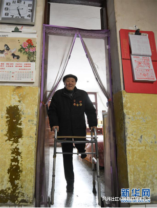 左腿截肢的張富清依靠支撐架在家裏活動(3月31日攝)。新華社記者 程敏 攝