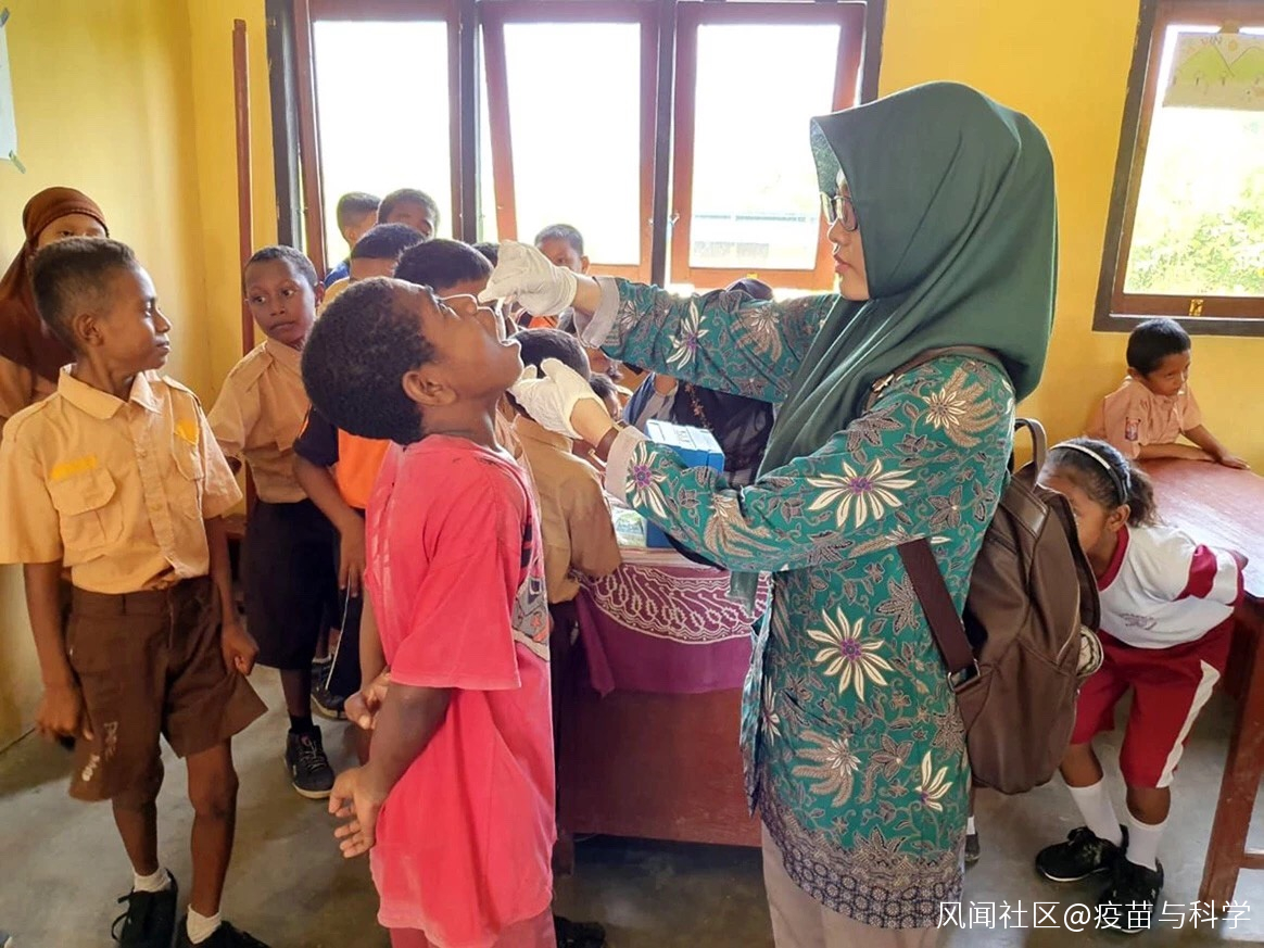 印尼的接種醫生Mirnawati正在給學校兒童服用脊灰疫苗