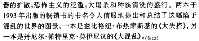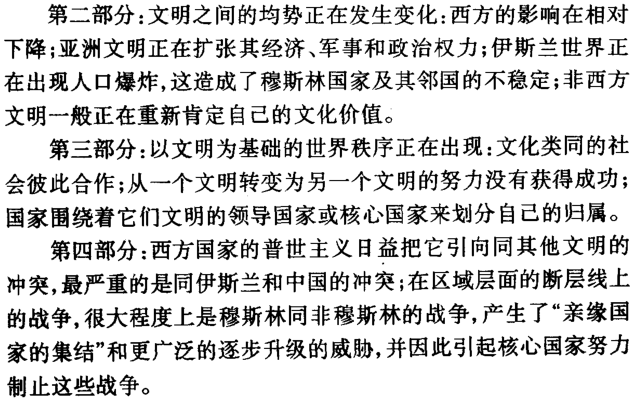 在《文明的衝突與世界秩序的重建》的第一部分,亨廷頓描述了冷戰後的混亂世界,其中提到