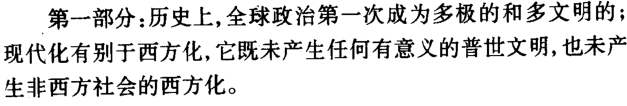 第一部分説,現代化不等於西方化。這就是特殊性和一般性的區別。現代性是個一般性,西方性是個特殊性。儘管有很多非西方社會(比如日本)實現了現代化,但沒有一個非西方社會歸化成了西方。這很有道理。