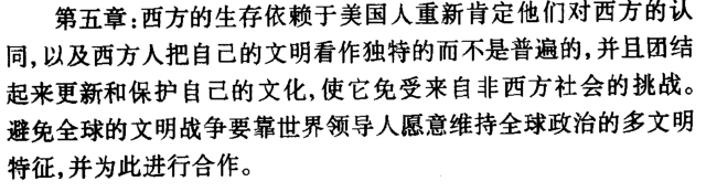 第五部分説,拋棄制度競爭,西方要在“文明”的旗號下團結起來,保衞西方。這不就是在學習中國嗎?用“文明”的偽裝,守住民族國家的底線。