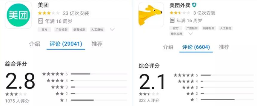 現在,在華為手機應用市場上,美團APP的評分低至2.8分,而美團外賣的評分更是低至2.1分(滿分為5分)。
