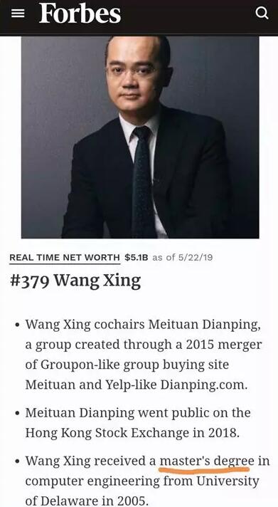 王興就和導師説,博士不念了,要回去創業,於是拍屁股就走人了。後來,福布斯網站上的王興資料,寫的是特拉華大學碩士學位。