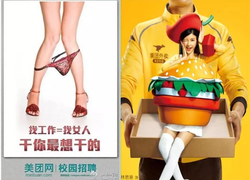2016年,美團外賣做出一系列物化女性的廣告,宣傳圖案中,女性被放在餐盒裏。