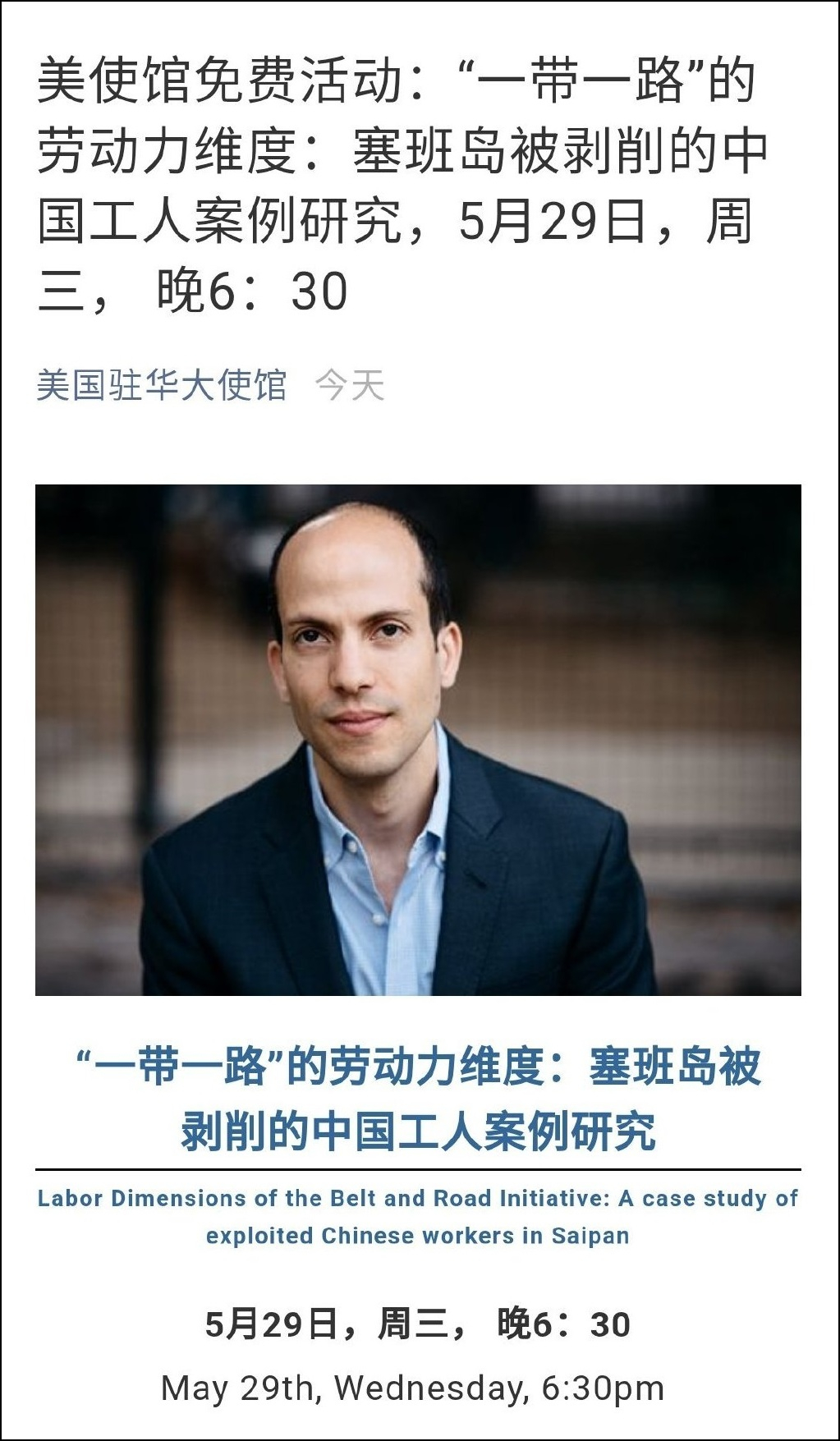 其介紹,在紐約專門從事勞工保護的美國律師Aaron Halegua是此次活動的主講人,他將分享一則數家中資企業承建塞班島一基建工程後拖欠1400萬美元工資,後經美國勞工部介入討回的案例。文章預告稱,Aaron Halegua將主要探討“案例暴露説明了什麼?政府應該採取什麼措施來保護海外勞動者的權利?”等問題。
