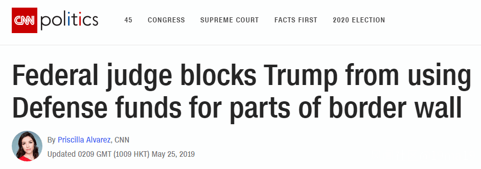 美聯邦法官發佈初步禁令 阻止特朗普用國防資金修美墨邊境牆2019-05-25 10:48 環球網 侯佳欣 【環球網報道 記者 侯佳欣】當地時間24日,美國加州一名聯邦法官海伍德•吉利厄姆發佈一份56頁的法院裁決書,阻止總統特朗普將國防部資金用於建造美墨邊境牆。