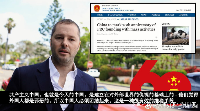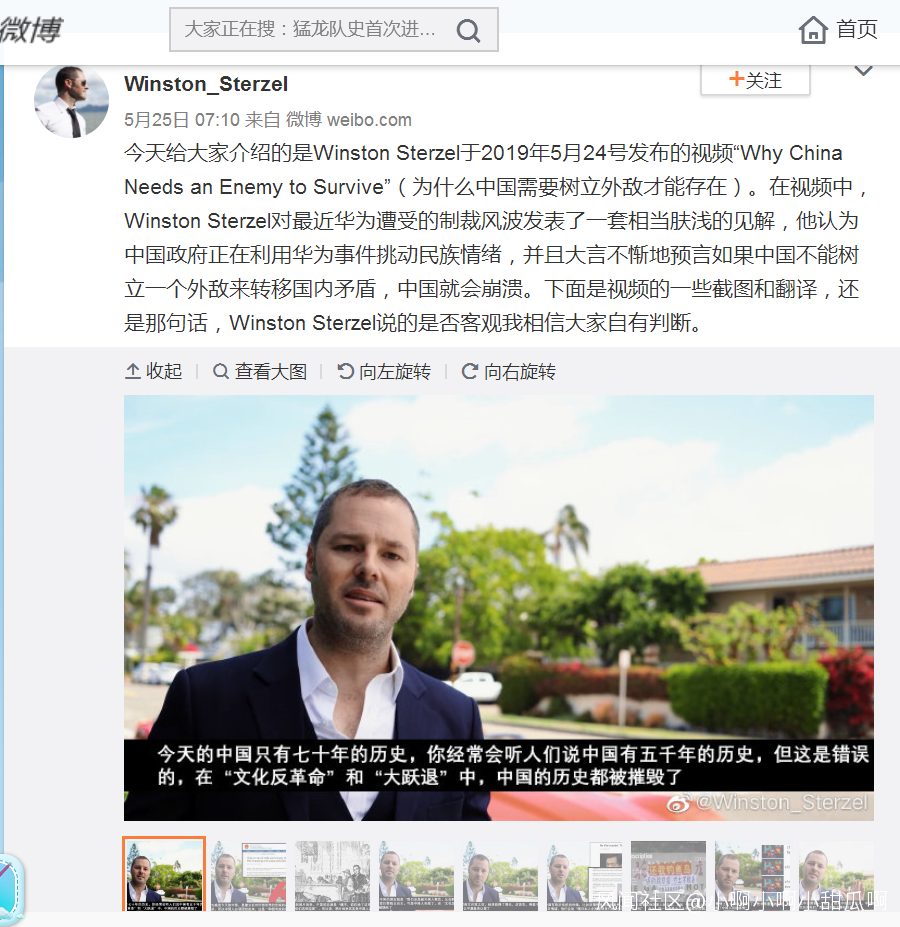 視頻中,**Winston對最近華為遭受的制裁風波發表了一套相當膚淺的見解,他認為中國政府正在利用華為事件挑動民族情緒,並且大言不慚地預言如果中國不能樹立一個外敵來轉移國內矛盾,中國就會崩潰。**下面是視頻的一些截圖和翻譯,Winston説的是否客觀我相信大家自有判斷。