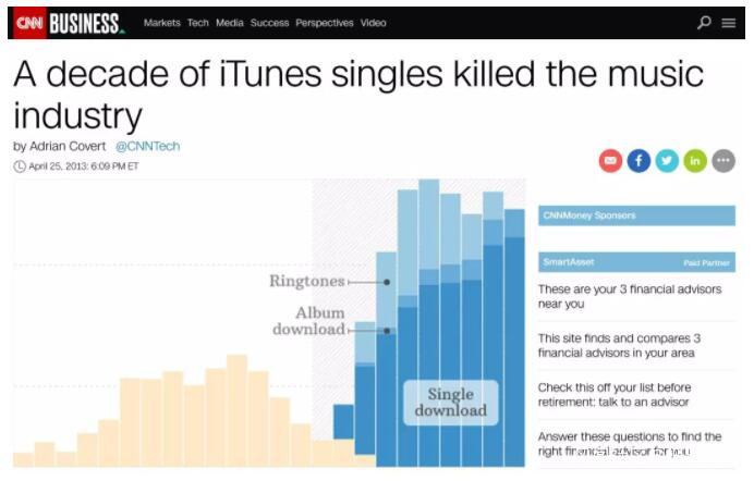 另外,付費下載改變了音樂消費觀念,衝擊了傳統唱片業消費模式下的按專輯消費的習慣。比如CNN的一篇文章就認為iTunes的單曲付費下載殺死了音樂產業。