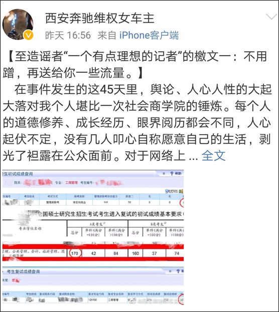 翻頁看@西安奔馳維權女車主和@一個有點理想的記者微博發佈的文章。