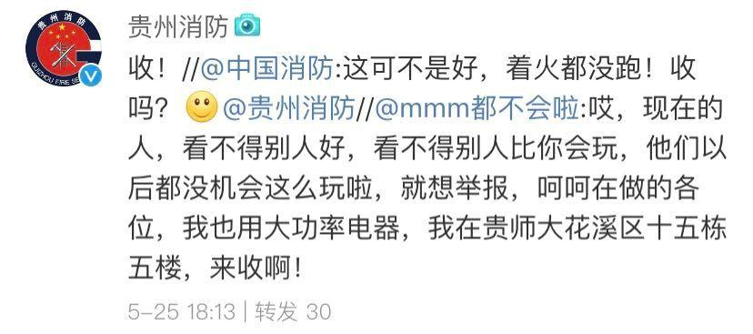 5月25日晚,@中國消防 收到一條在線挑釁:“我也用大功率電器,我在貴師大花溪區……來收啊!”