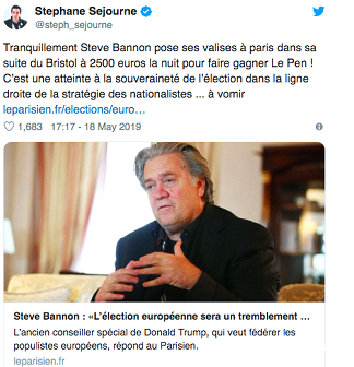 而法國總統馬克龍所屬的“共和國前進黨”(LREM)關鍵人物對這位不速之客非常不滿。LREM競選主任**斯特凡****·****賽儒爾奈(Stéphane Séjourné)**在推特上怒罵班農,指責其目的十分明確,那就是助勒龐的黨派獲勝。他氣憤地説:“這是對選舉的攻擊,他使人作嘔。”