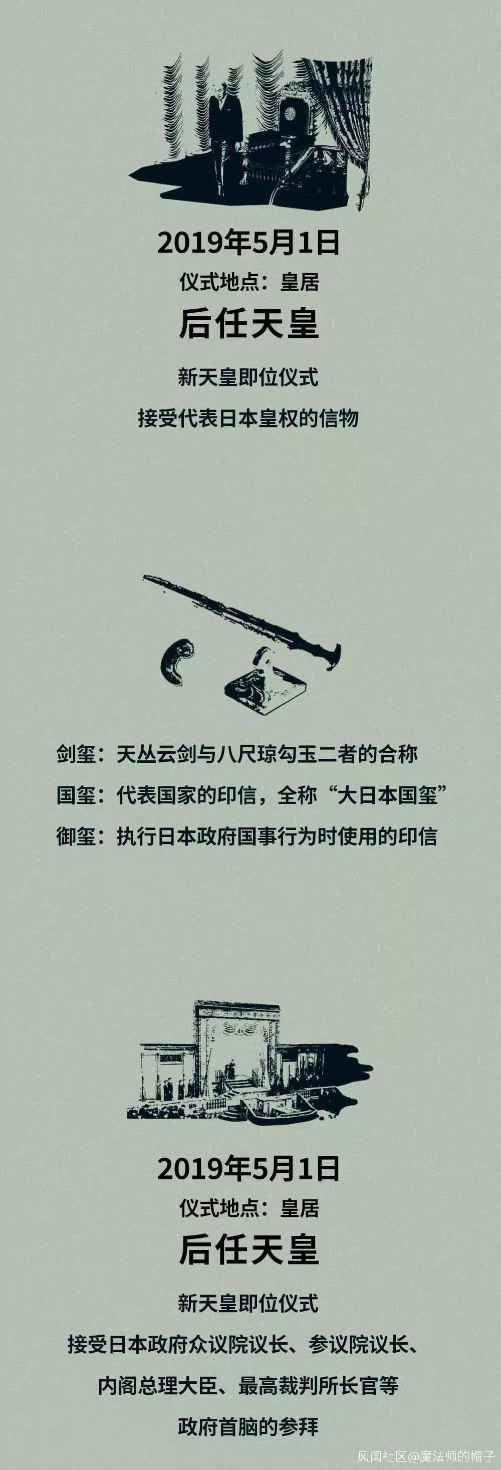 日本於當地時間1日上午10時30分,德仁天皇在“松之間”宮殿參加了即位的“繼承劍璽等物的儀式”,繼承包括劍和勾玉在內的三種天皇代代相傳的“神器”。