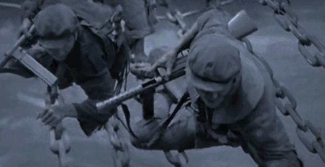 電視劇《長征》中細緻地刻畫了當時這一壯烈場面,由22位勇士組成的突擊隊,冒着槍林彈雨在瀘定橋的鐵索上匍匐前進,而此時助他們反擊川軍火力的卻是來自1941年的斯登衝鋒槍。