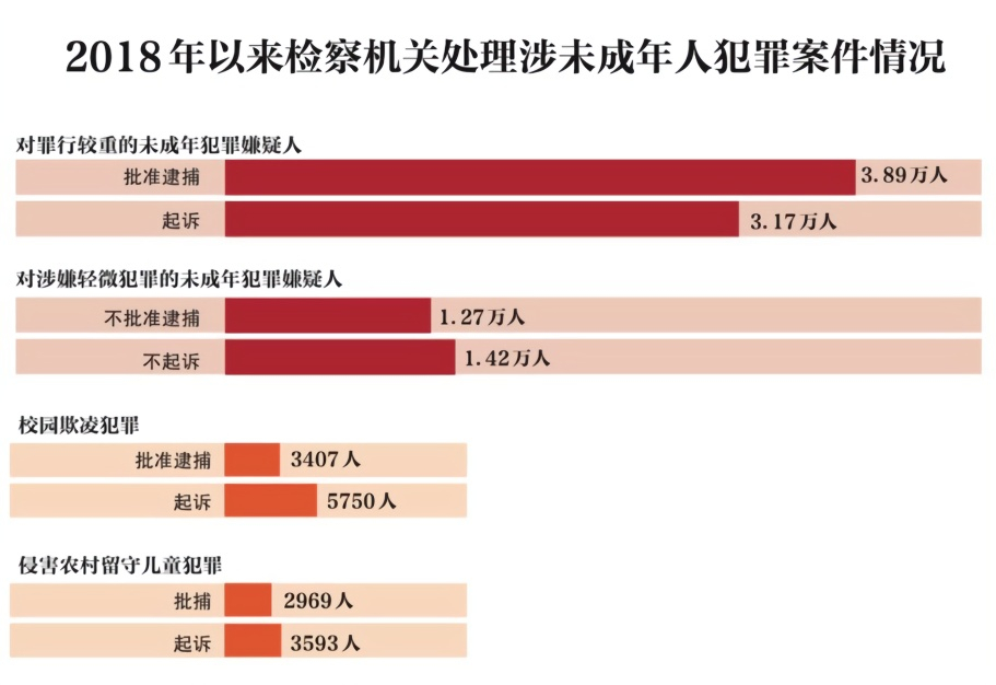 去年以來,檢察機關共對罪行較重的未成年犯罪嫌疑人批准逮捕3.89萬人,起訴3.17萬人,保持必要的司法懲戒;對涉嫌輕微犯罪的未成年犯罪嫌疑人堅持依法從寬處理,不批准逮捕1.27萬人,不起訴1.42萬人。