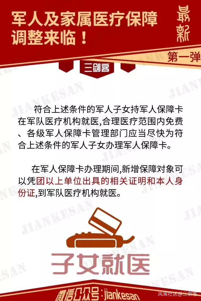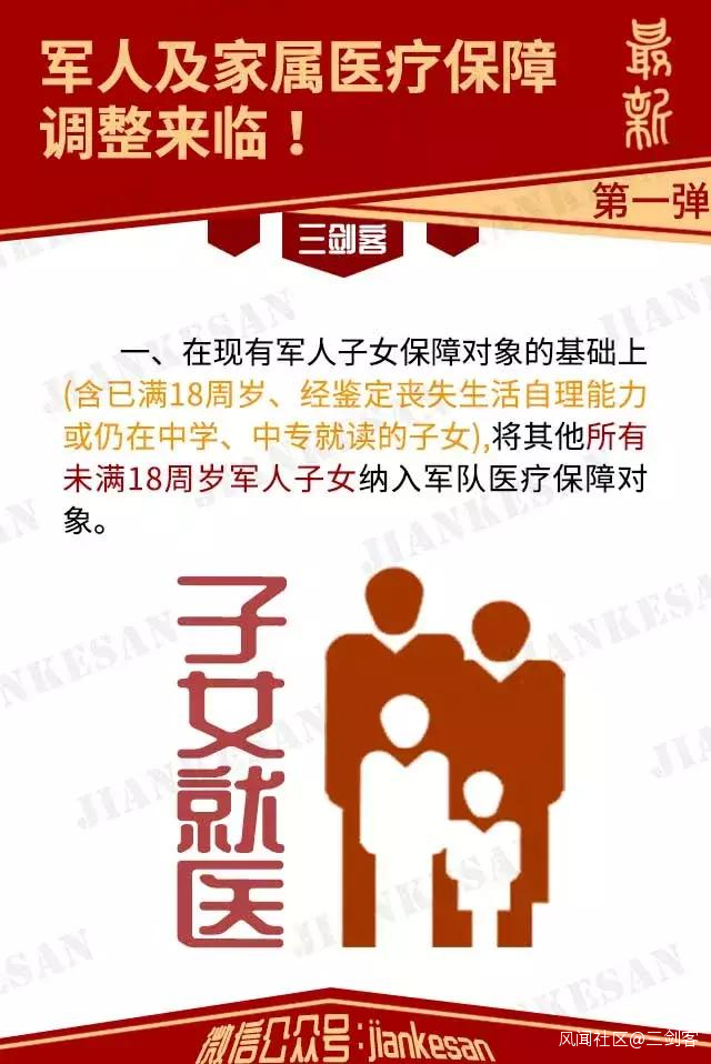 這幾年,軍隊醫療改革惠及軍人和軍屬大家有目共睹,繼全軍幹部在軍隊醫院門診就醫實現“一卡通”後,士官、義務兵、學員及持有軍人保障卡的軍人家屬也加入“一卡通”隊伍,現又將所有未滿18歲的軍人子女納入軍隊醫療保障對象,醫療方面多項政策紅利落地。