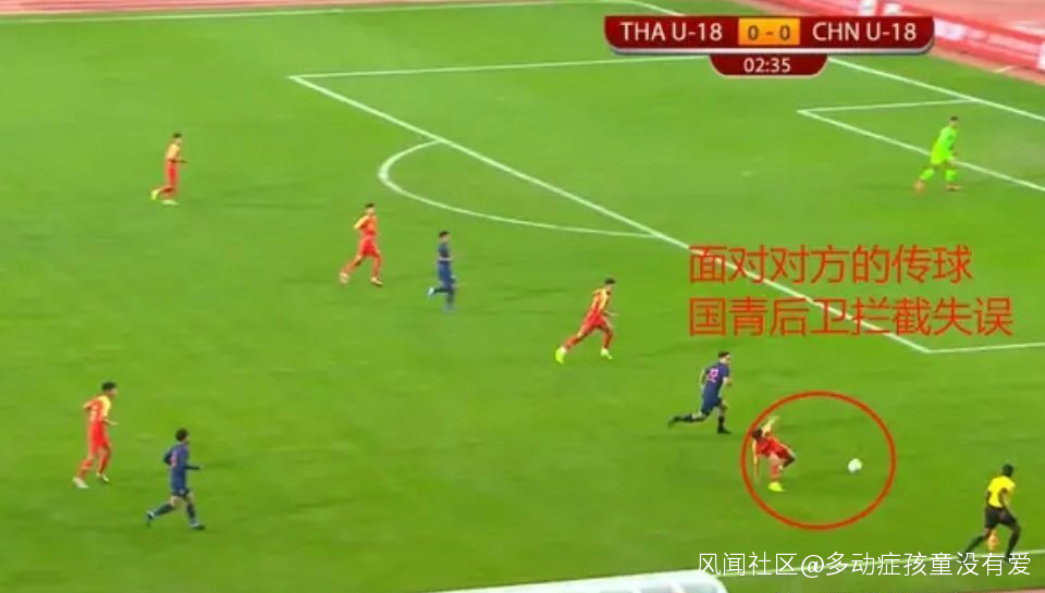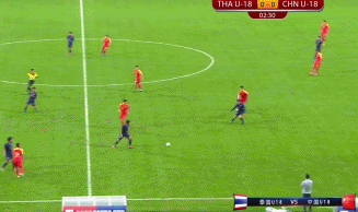 第3分鐘,泰國U18就打破僵局。這原本是國青隊的進攻機會,韓東在後場左路嘗試帶球突破,但泰國球員很輕鬆就將球攔截下來。泰國U18順勢發動反擊,從右路送上一腳質量並不算高的直傳球。國青左後衞高天語,負責盯防泰國隊前插的球員。
