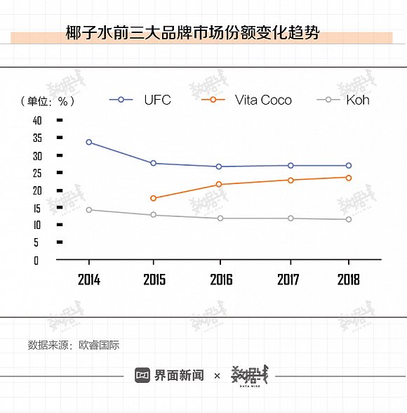 歐睿國際的數據顯示,Vita Coco的市場佔有率從2015年的17.6%增長至2018年的,增長速度超過了UFC和Koh。