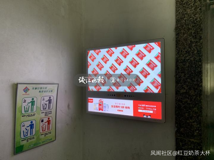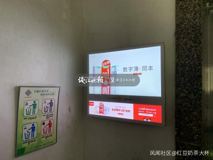 5月28日中午,浙江24小時、錢江晚報記者來到文錦苑小區,觀察了電梯外的電子屏,發現循環播放着的廣告涉及的產品比較多,有汽車、婚紗旅拍、兒童手錶、飲料、尿不濕、家教機、咖啡等,一則杜蕾斯穿插在其中,和其它廣告一起交替播放。