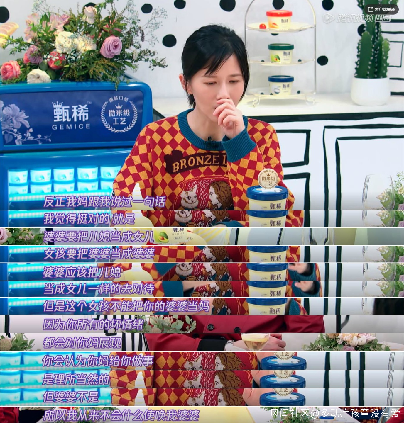 她説,自己從母親那裏學習到這麼一句話,“婆婆要把兒媳當成女兒,女孩要把婆婆當成婆婆”。前半句話好理解,就是婆婆對待兒媳要視如己出,而後半句話則是要告誡每一個女孩子,不能把婆婆當成自己的親媽,不要把自己的壞情緒向婆婆展現,不要認為婆婆為自己做事也會像親媽一樣理所當然。