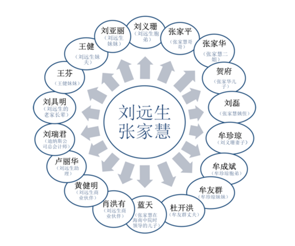 據看看新聞Knews記者多方調查,在張家慧、劉遠生龐大的家族企業羣出任控制人或高管的,主要有張家慧的哥哥張家平、二姐張家華,姨侄賀府、劉磊;劉遠生的胞弟劉義珊、弟媳牟珍瓊,胞妹劉亞麗、妹夫王健,以及牟珍瓊的弟弟牟成斌、妹妹牟友羣夫婦等;還有劉遠生長期的商業合作伙伴肖洪有、黃健明,張家慧早年履職海南中院時的一位領導之子藍天等。