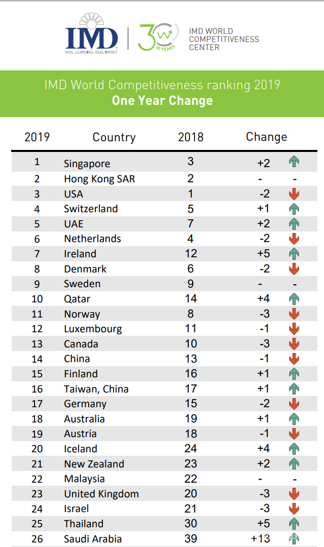 瑞士洛桑國際慣例發展學院(IMD)28日公佈的《2019年世界競爭力年報》顯示,新加坡取代美國成為全球最具競爭力的經濟體,自2010年以來首次榮登榜首;中國香港繼續保持在第二位,美國則跌至第三。