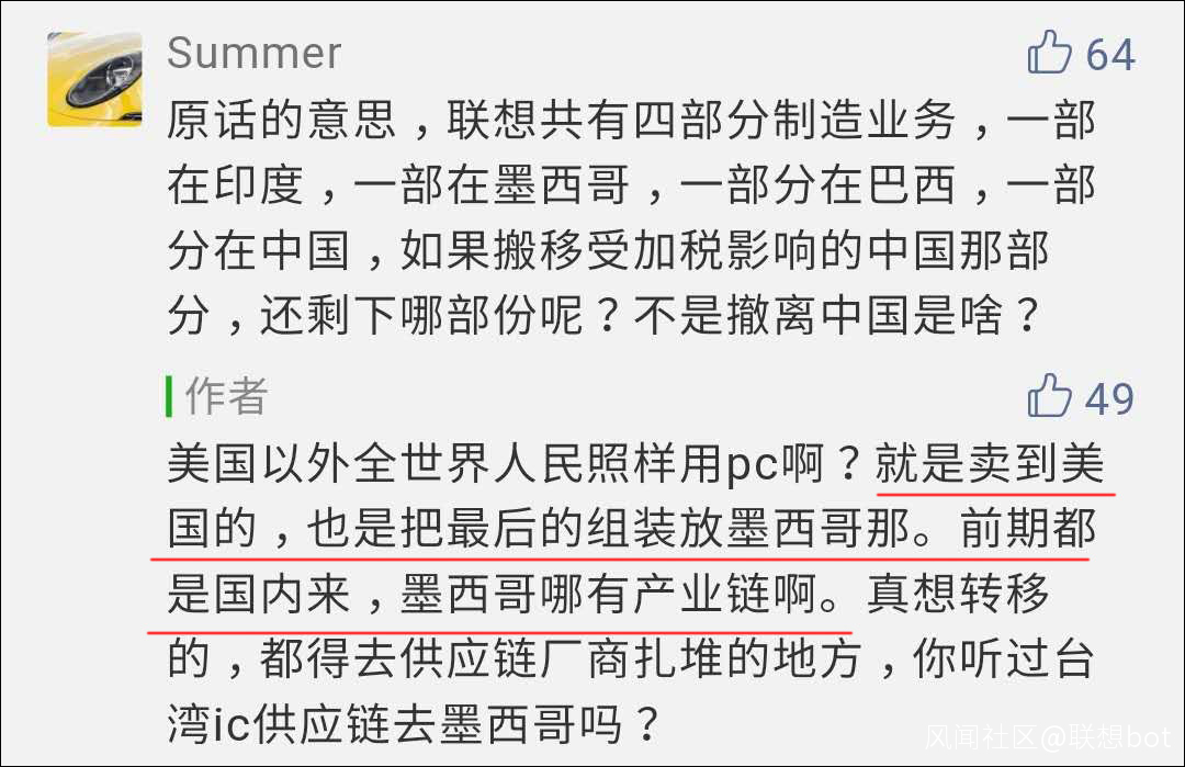 該小編還表示,賣到美國的PC,也是最後的組裝放到墨西哥哪裏,前期的生產全都是國內來。