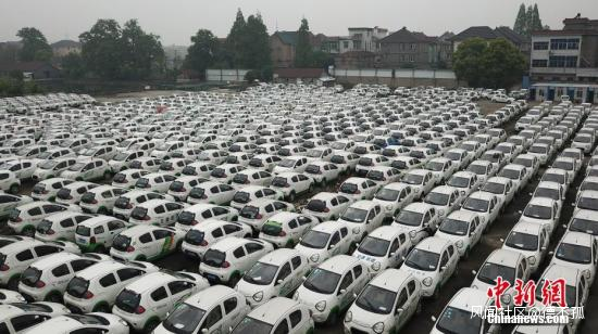 浙江杭州近3000輛被淘汰的新能源共享汽車密集停放在錢塘江邊。中新社發 張洋 攝